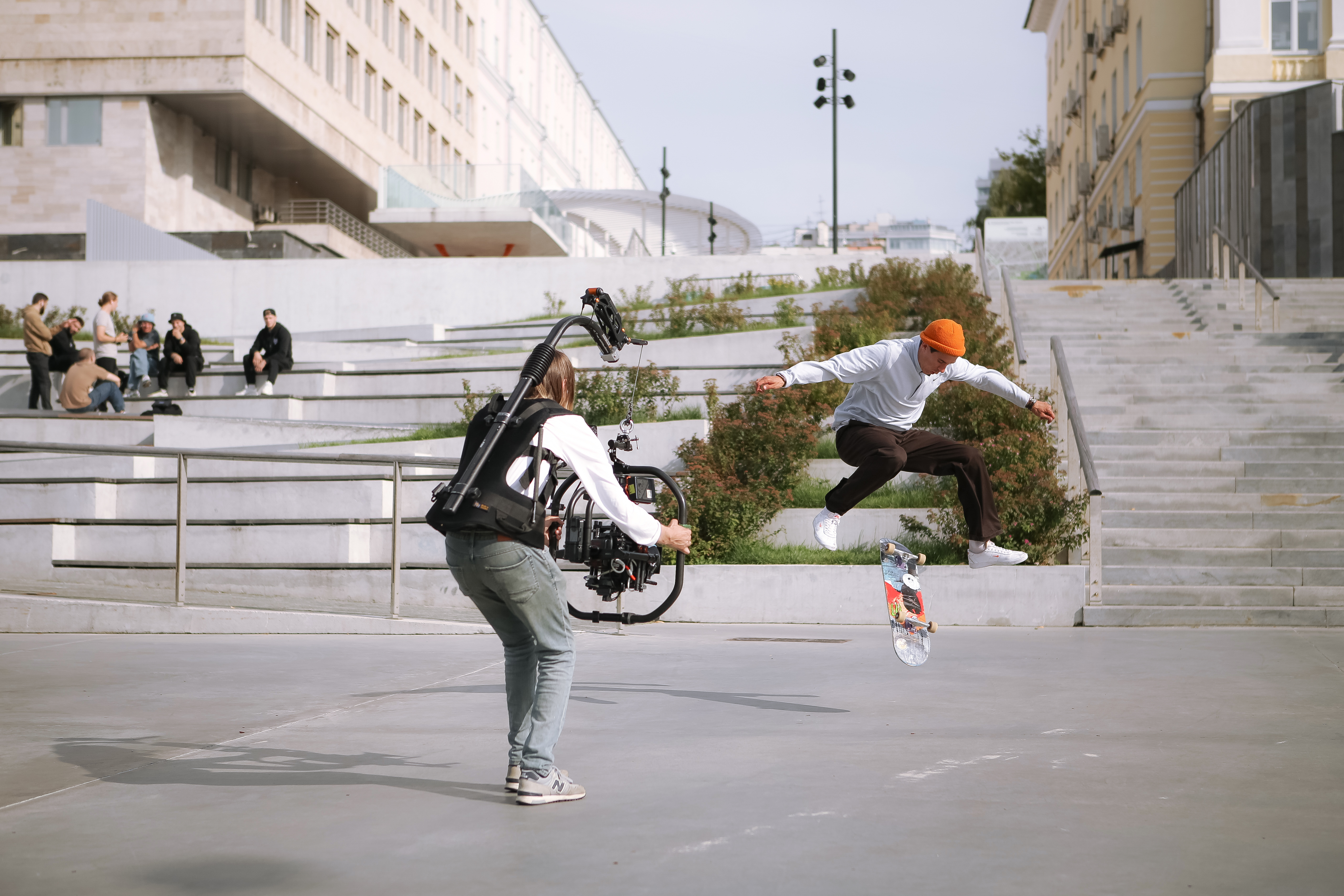 Площадкой для катания стала пустая Москва постковидного периода, чистые улицы, современная архитектура и геометрия города.